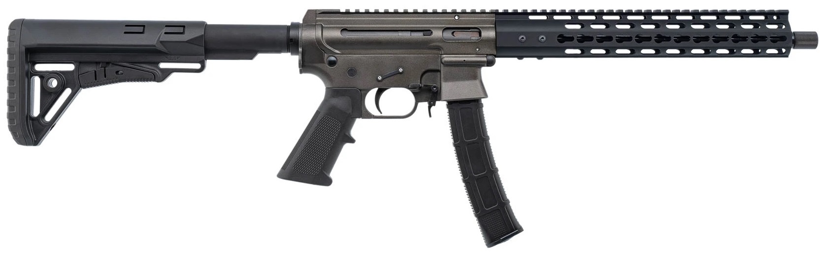 Ствольная коробка двухсоставная, выполнена в компоновке Upper/Lower. Верхняя часть объединяет крышку, ствол, кожух, детали затворной группы. На поверхности верхней части по всей длине расположена планка Пикатинни. Конструкция нижней части представлена единой деталью, объединяющей спусковую скобу и шахту-приемник магазина. Во внутреннем пространстве размещены ударно-спусковой механизм и возвратная пружина с буфером отдачи. Задняя торцевая часть пружины частично входит в полость профилированной трубы телескопического приклада. Обе части ствольной коробки отлиты из авиационного алюминия. Для их разъединения требуется выдавить два пина, размещенных в нижней части lower. Окно экстракции расположено справа. Внешние поверхности всех металлических деталей защищены покрытием Cerakote. Ударно-спусковой механизм одинарного действия, нерегулируемый. Предохранитель флажкового типа, двухпозиционный, расположен над рукоятью управления огнем с левой стороны. Рукоять выполнена из пластика и снабжена упорами под пальцы.