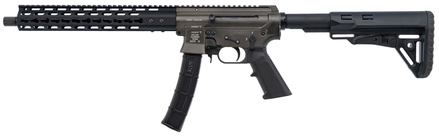 Карабин ТК509 был запущен в серийное производство на рубеже 2020 - 2021 г. на площадках ЗАО "Техкрим". Основным назначением проекта являлось создание огнестрельной системы, предназначенной для спортивного и охотничьего применения, самообороны и любительской стрельбы. Немного раньше, в 2018 - 2019 гг., конструкторами предприятия "Техкрим" был разработан оригинальный гражданский боеприпас в калибре 345 ТК. Основой для нового патрона послужила обрезанная до 22 мм автоматная гильза калибра 5.45х39 мм. В качестве поражающих элементов применяются биметаллические пули (оболочечные и экспансивные), их масса варьируется в диапазоне 6,5 - 9,5 г. Начальная скорость пули равняется 300 - 450 м/с. По характеристикам дальности выстрела, его настильности и поражающей способности боеприпас калибра 345 ТК близок к показателям пистолетных патронов 9х19 mm Luger. По отзывам владельцев оружия под этот боеприпас, основной проблемой является его более высокая стоимость по сравнению с классическими пистолетными.