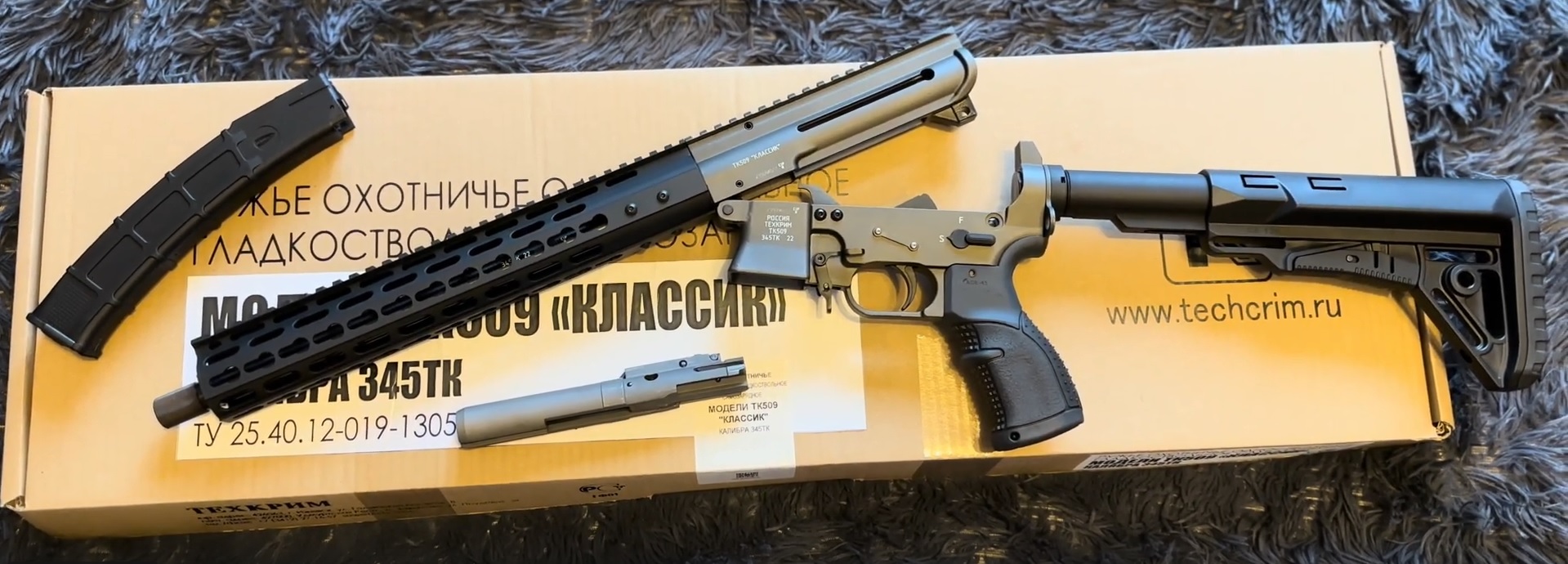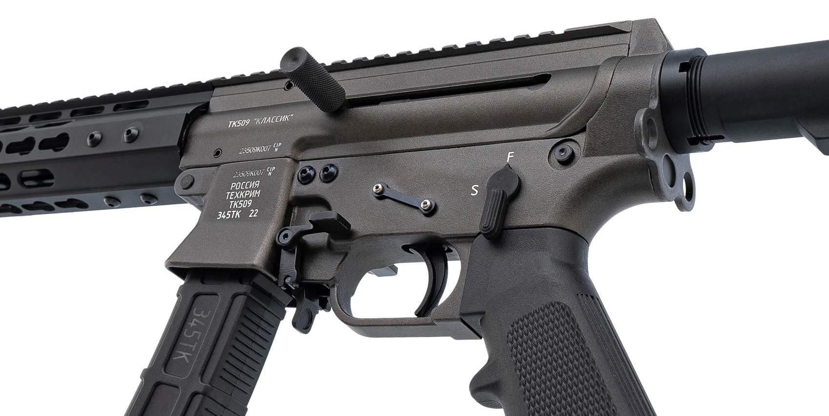 В ТК509 использовано макcимально возможное количество деталей стандарта AR-15. Это все элементы удержания оружия, детали ударно-спускового механизма и ударник. Узел защёлки магазина у ТК509 оригинальный, спроектированный и изготовленный на "Техкриме". Он обеспечивает надёжную фиксацию и быстрый сброс магазинов стандарта "Витязь" (TR9) всех производителей. Рукоятка взведения затвора соединена с затвором и может быть установлена как слева, так и справа на усмотрение стрелка.
